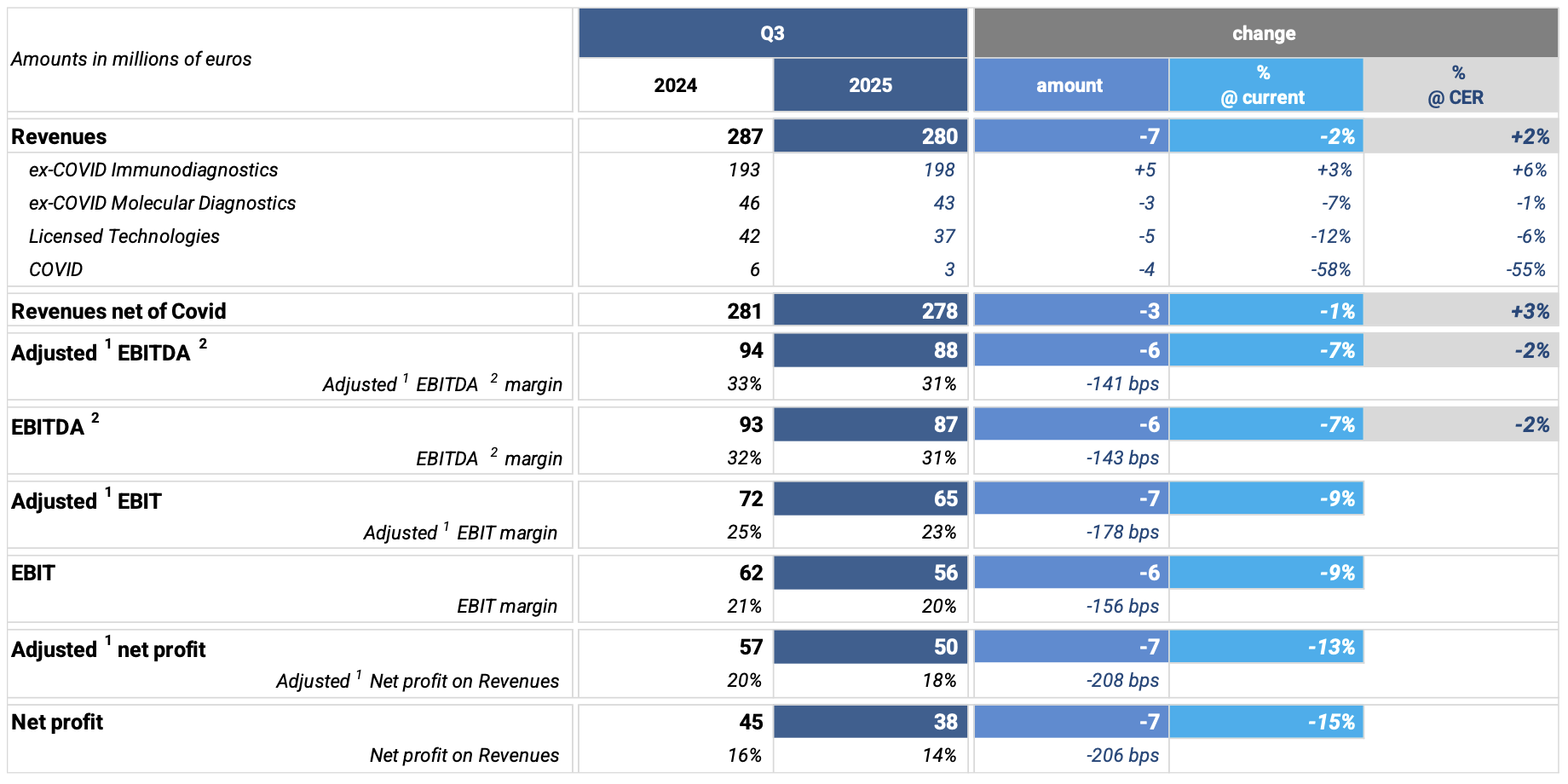 · Immunodiagnostics ex-COVID: € 616 million in 9M’25, up € 33 million, +6% (+7% at CER) compared to the same period in 2024, driven by strong CLIA specialty test sales.