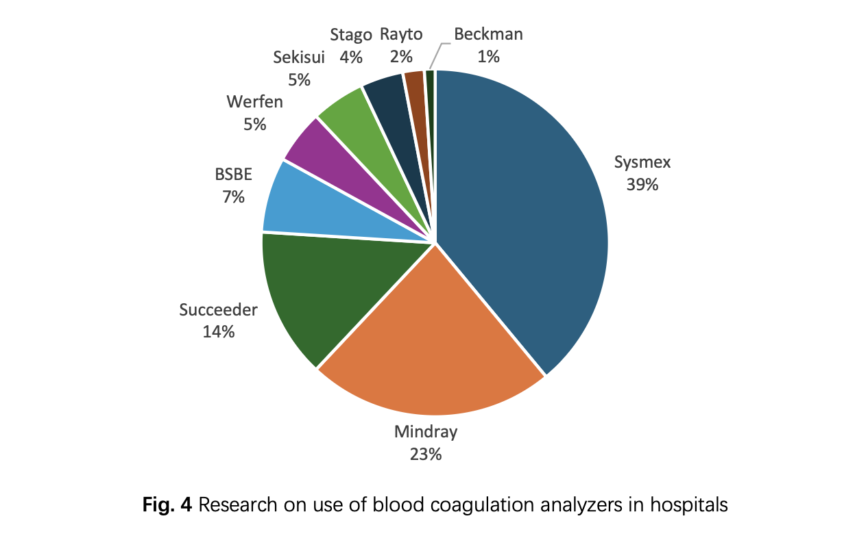 The instruments employed by hospitals participating in the basic study were mainly from various manufacturers such as Sysmex, Stago, Werfen, Sekisui, Beckman, Mindray, Succeeder, BSBE, and Rayto, involving 96 instruments, of which 11 hospitals used instruments from two manufacturers, with the use of each brand of blood coagulation analyzers shown in Fig. 4. As shown from the figure, among the hospitals participating in the study, the proportion of hospitals using Sysmex instruments was 39%, the proportion of those using Mindray was 23%, followed by 14% for Succeeder and 7% for BSBE, indicating that the domestic instruments have been recognized by hospitals to a certain extent. Among the 80 hospitals participating in the study, 75 hospitals had used the corresponding matching reagents, while 5 hospitals had chosen reagents of non-instrument brands; in terms of the selection of consumables, 74 hospitals used matching consumables, indicating that these hospitals preferred to choose the original matching reagents and consumables, with the reason being that the selection of matching reagents and consumables could largely ensure the suitability between the items and the instruments. However, the use of non-instrument brand reagents and consumables signifies that due to the cost pressure of imported reagents and the advocacy of national policies, some hospitals are prepared to choose manufacturers with reliable quality and cost advantages, such as Shanghai Sun Biotech and BSBE.